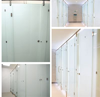 Suitable for both shower and WC cubicle environments. Door, Division and Pilaster panel elements are manufactured from 10mm clear glass and faced one side with a RAL 9010 white screen print prior to being kiln toughened at which point the paint finish fuses into the glass giving an extremely durable surface finish.