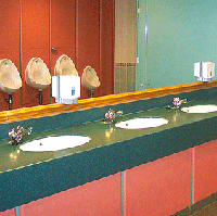 Solid surfacing vanity units in public washrooms stand up to the most critical scrutiny. Quick and easy to clean, saving man-hours, and combining elegance with durability to create a stylish appearance. Non-porous, stain resistant, seamless bowls and coved upstands give the versatility required. Add a fully framed laminated unit below and altogether you have a system ideal for office, hotel and retail installations.